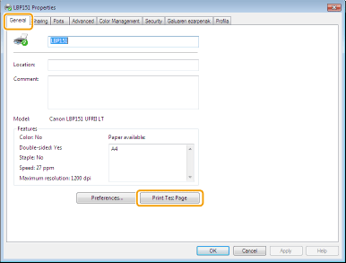 [General] fitxan, sakatu [Print Test Page] aukeran.