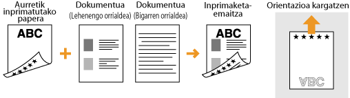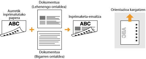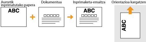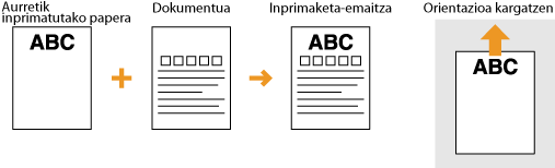 Atal honetan azaltzen da nola kargatu behar den aurrez inprimatutako papera, dagokion norabidean eta eskuineko aldea gorantz. Erretiluan edo erabilera anitzeko erretiluan papera kargatzeko deskribapen osoa ikusteko, kontsultatu: