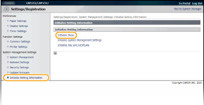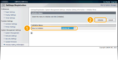 Hautatu hasieratu nahi dituzun ezarpenak goitibeherako zerrendatik. Hautatu [Initialize All] [Display Settings], [Timer Settings], [Common Settings] eta [Printer Settings] ataletako ezarpen guztiak batera hasieratzeko.