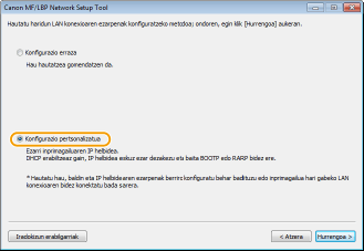Konexio-metodoa hari gabeko LAN saretik haridun LAN sarera aldatu ondorenBeharrezkoa da instalatutako inprimagailu-kontrolatzailea desinstalatzea, haridun LAN sarea konfiguratzea eta berriz ere inprimagailu-kontrolatzailea instalatzea honen arabera: Inprimagailu-kontrolatzailea instalatzeko gida. Haridun LAN sarearen konexioa konfiguratzean, hautatu [Konfigurazio pertsonalizatua] konfigurazio-metodo gisa.