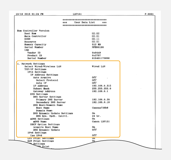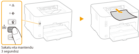 (Papera) tekla eta mantendu sakatuta 3 segundoz ezarpenen zerrenda inprimatzeko. Horrela, IPv4ren ezarpenak, MAC helbidea eta haridun eta hari gabeko LANaren ezarpenak egiaztatu ahal izango dituzu. Konfigurazio-zerrenda A4 paper-tamainan inprimatzeko formatua du. Inprimatzen hasi baino lehen, kargatu A4 paper-tamaina erretiluan. Papera kargatzea paper-erretiluan