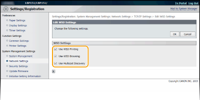 Hautatu kontrol-laukia ordenagailu batetik makinaren inguruko informazioa lortzeko WSD erabiliz. Kontrol-lauki hau automatikoki hautatzen da [Use WSD Printing] kontrol-laukia hautatzean. [Use Multicast Discovery]