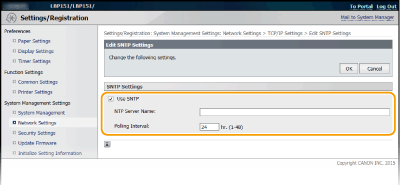 NTP/SNTP zerbitzariarekin ezarritako komunikazioaren egiaztapenaMakina erregistratutako ordu-zerbitzariarekin komunikatzen ari den ala ez egiaztatzeko aukera dago. Sakatu [Settings/Registration]