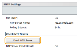 [Network Settings] [TCP/IP Settings], [SNTP Settings] bistaratuko dira, eta orduan sakatu [Check NTP Server]. Konexioa behar bezala ezarri bada, emaitza behean adierazi bezala bistaratuko da. (Kontuan izan eragiketa honek konexioa soilik egiaztatzen duela. Ez du sistemaren erlojua doitzen). ![]() |