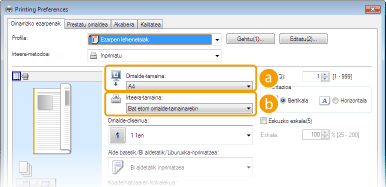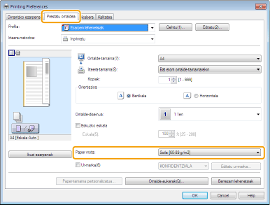 Inprimatu baino lehen, zehaztu paper-iturrian kargatutako paperaren tamaina eta mota.