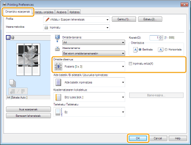 Bi aldetatik inprimatzea gaituta dagoenean, ezin dira hautatu poster-tamainaren ezarpenak. Hautatu [Alde batetik inprimatzea] [Alde batetik/Bi aldetatik/Liburuxka-inprimatzea] atalean, eta ondoren, hautatu poster-tamainaren ezarpen bat.
