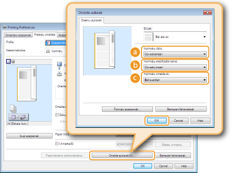 Datak, saioa hasteko izenak edo orrialde-zenbakiak inprimatzean, formatuaren xehetasunak alda ditzakezu, hala nola letra-tipoa edo letra-tamaina. Xehetasunak zehazteko, egin klik goian agertzen den [Orrialde-aukerak] pantailako [Formatu-ezarpenak] aukeran.