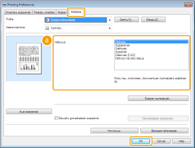 [Helburua] atalean hautatutako elementu bakoitzaren ezarpen xehetuak zehazteko, egin klik [Ezarpen aurreratuak] aukeran. Informazio gehiago lortzeko, egin klik [Help] aukeran inprimagailu-kontrolatzailearen pantailan.