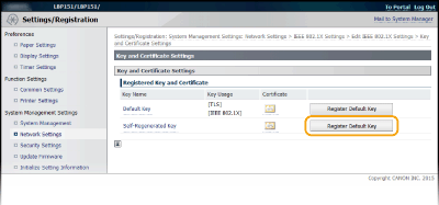 Sakatu [Register Default Key] bezeroaren autentifikaziorako erabili nahi duzun gako-parearen eskuinaldean.