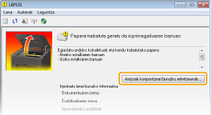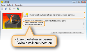 (Alarma) adierazlea keinuka hasiko da eta <Papera trabatuta geratu da inprimagailuaren barruan> mezua eta trabatutako paperaren kokalekua bistaratuko dira inprimagailuaren egoera-leihoan. Konpondu paper-trabatzeak bistaratzen diren kokalekuen ordenaren arabera aurreragoko ataletan deskribatutako prozedurei jarraikiz. Hasi aurretik, irakurri arretaz segurtasun-argibideak hemen: Segurtasun-argibide garrantzitsuak.