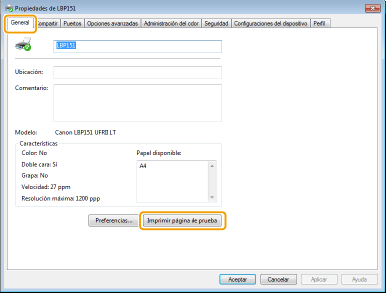En la pestaña [General], haga clic en [Imprimir página de prueba].