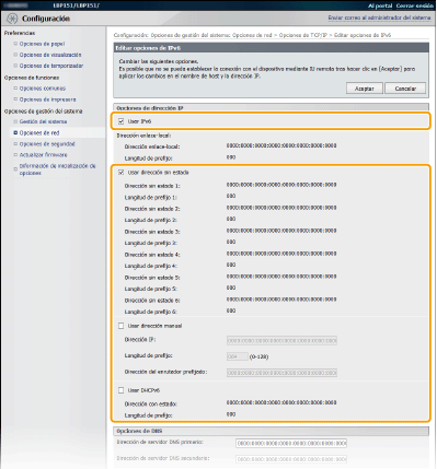 Si desea introducir una dirección IPv6 manualmente, marque la casilla de verificación e introduzca valores en los cuadros de texto [Dirección IP], [Longitud de prefijo] y [Dirección del enrutador prefijado]. Desmarque la casilla de verificación si no desea introducir ninguna dirección manual.