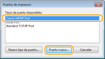 Podrá añadir un puerto MFNP únicamente si ha instalado el controlador de impresora desde el DVD-ROM suministrado, o si se descargó e instaló el controlador de impresora desde el sitio web de Canon.