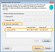 Este puerto permite que la dirección IP del equipo sea detectada automáticamente. Aun en el caso de que la dirección IP del equipo cambie, la conexión se mantendrá, ya que el equipo y el ordenador tienen la misma subred. Por tanto, no tendrá que añadir un puerto nuevo cada vez que cambie la dirección IP. Si está utilizando el equipo en un entorno IPv4, lo normal es que seleccione este tipo de puerto.