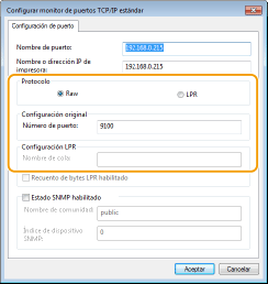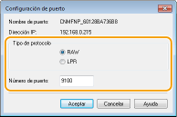 Si se ha cambiado el protocolo de impresión (LPD o RAW) en el equipo (Configuración de protocolos de impresión y de servicios web) o se ha cambiado el número de puerto (Cambios en los números de puerto), también deberán configurarse en el ordenador las opciones correspondientes. Esta operación no es necesaria para puertos WSD.