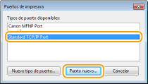 Si se selecciona un puerto incorrecto durante la instalación de un controlador de impresora desde la carpeta de la impresora de Windows, deberá agregar un puerto nuevo. Existen dos tipos de puertos: "Puerto MFNP" y "Puerto TCP/IP estándar". Seleccione un tipo de puerto u otro en función del entorno que utilice.