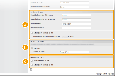 DNS (Sistema de nombres de dominio) ofrece un servicio de resolución de nombres que asocia un nombre de host (o dominio) con una dirección IP. Configure las opciones de DNS, mDNS o DHCP en función de su red. Tenga en cuenta que los procedimientos para configurar DNS difieren de los de IPv4 e IPv6.