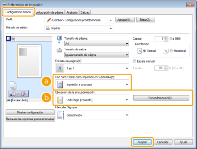 Seleccione [Impresión a una cara] o [Impresión a doble cara] en [Una cara/Doble cara/Impresión en cuadernillo]