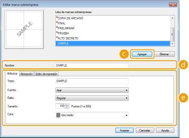 Haga clic en cada pestaña para especificar el texto, el color o la posición de impresión de la marca sobreimpresa. Para obtener más información, haga clic en [Ayuda] en la pantalla del controlador de impresora.