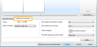 Haga clic en la pestaña [Configuración de impresión] para visualizar la pantalla de especificación de las opciones de impresión, como el número de copias o la impresión a una cara/doble cara. Las opciones especificadas aquí se aplican a todo el trabajo de impresión.