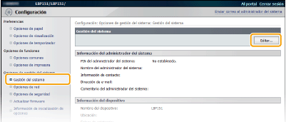 Para cambiar la configuración del equipo desde el IU remoto se necesitan derechos de acceso de administrador. Inicie sesión como administrador y siga este procedimiento para establecer el PIN (contraseña del administrador del sistema). La contraseña del administrador del sistema es fundamental para la seguridad del equipo. Asegúrese de que únicamente los administradores del sistema conocen esta contraseña.