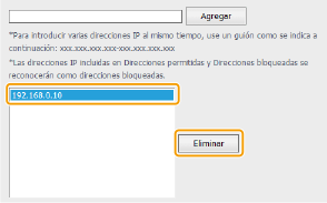 Seleccione la dirección IP que desea eliminar y, a continuación, haga clic en [Eliminar].