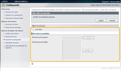 Introduzca la dirección MAC en el cuadro de texto [Dirección para guardar] y haga clic en [Agregar]. Permite la comunicación (recibida) únicamente con dispositivos que tengan direcciones MAC registradas y restringe la comunicación con dispositivos con cualquier otra dirección MAC.