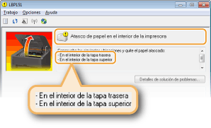 (Alarma) parpadeará y se mostrará el mensaje <Atasco de papel en el interior de la impresora> y los lugares donde se han producido atascos de papel en la Ventana de estado de impresora. Saque el papel atascado de los distintos lugares en el orden que se le indica siguiendo los procedimientos que se describen en las secciones siguientes. Antes de hacerlo, lea detenidamente las instrucciones de seguridad de Instrucciones de seguridad importantes.
