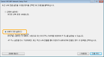 연결 방법을 무선 LAN에서 유선 LAN으로 바꾼 후현재 설치되어 있는 프린터 드라이버를 제거하고, 유선 LAN 연결을 구성한 다음 프린터 드라이버 설치 설명서와 함께 제공된 프린터 드라이버를 다시 설치해야 합니다. 유선 LAN 연결 구성 시, 구성 방법에 대해 [사용자 지정 설정]을 선택하십시오.