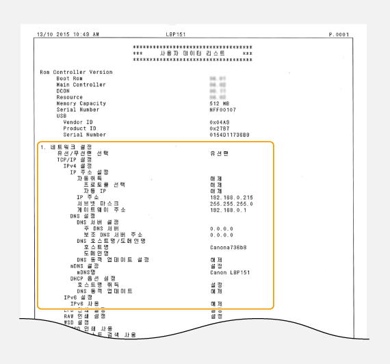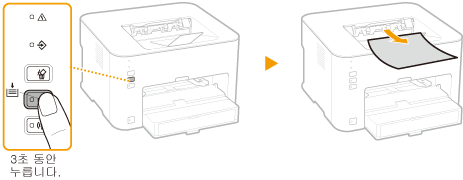 (용지) 키를 3초간 누른 상태에서 기기 설정의 목록을 인쇄합니다. 그러면 IPv4 설정, MAC 주소 및 유선/무선랜 설정을 확인할 수 있습니다. 설정 목록은 A4 크기 용지에 인쇄되도록 서식이 지정됩니다. 인쇄하기 전에 카세트에 A4 크기 용지를 넣습니다. 카세트에 용지 넣기