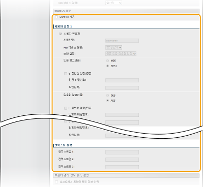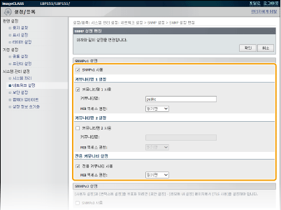 SNMP(Simple Network Management Protocol)는 MIB(Management Information Base) 데이터베이스를 사용하여 네트워크의 통신 장치를 모니터링하고 제어하기 위한 프로토콜입니다. 본 기기는 SNMPv1 및 보안 기능이 개선된 SNMPv3을 지원합니다. 문서를 인쇄하거나 모트 UI를 사용할 때 컴퓨터에서 기기의 상태를 확인할 수 있습니다. SNMPv1 또는 SNMPv3를 각각 또는 동시에 모두 활성화할 수 있습니다. 네트워크 환경과 사용 목적에 맞게 각 버전의 설정을 지정합니다.