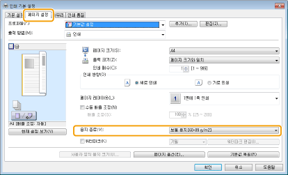 토너 때문에 더러워지거나 토너가 종이에서 떨어지는 경우표면이 거친 종이를 사용하거나 또는 옷이 토너로 인해 더러워지는 경우, [용지 종류]를 [증권 용지1[60-90 g/m2]], [증권 용지2[91-120 g/m2]] 또는 [증권 용지3[121-163 g/m2]]로 설정합니다.