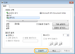 [장치] [인쇄] 사용 중인 프린터 [인쇄]를 탭하거나 클릭합니다.이 방법으로 인쇄할 경우 인쇄 설정 중 일부만 사용할 수 있습니다.