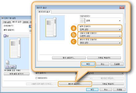 인쇄 날짜, 사용자 이름 및 페이지 번호를 인쇄할 위치 선택