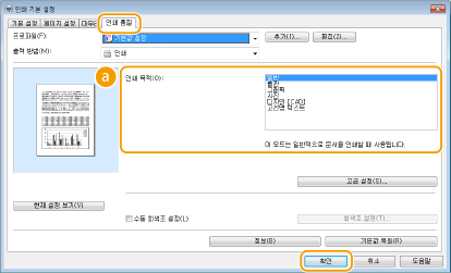 [인쇄 목적]에서 선택한 각 항목에 대해 세부 설정을 지정하려면 [고급 설정]을 클릭하십시오. 자세한 내용을 보려면 프린터 드라이버 화면에서 [도움말]을 클릭하십시오.