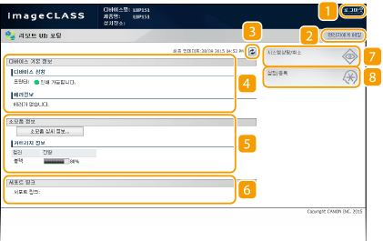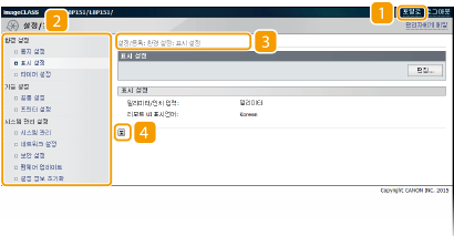 [설정/등록] 페이지를 표시합니다. 시스템 관리자 모드로 로그온되어 있으면 이 페이지를 사용하여 기기 설정을 변경할 수 있습니다.