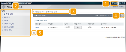 [시스템상황/취소] 페이지를 표시합니다. 이 페이지를 사용하여 현재 인쇄 상태를 확인하고 인쇄 처리를 취소하고 인쇄 작업의 내역을 볼 수 있습니다.