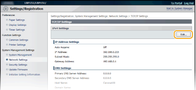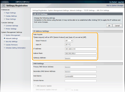ที่อยู่ IPv4 ของเครื่องสามารถกำหนดได้อัตโนมัติโดยโปรโตคอลการกำหนดที่อยู่ IP แบบไดนามิค เช่น DHCP หรือใส่ด้วยตนเอง ขณะเชื่อมต่อเครื่องเข้ากับ LAN แบบใช้สาย ตรวจสอบให้แน่ใจว่าได้เสียบขั้วต่อของสาย LAN เข้าไปในพอร์ตแน่นดีแล้ว (การเชื่อมต่อกับ LAN แบบผ่านสาย)