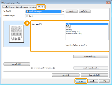 เลือกตัวเลือกที่เหมาะกับประเภทเอกสารหรือวัตถุประสงค์ของการพิมพ์ ยกตัวอย่างเช่น เลือก [ทั่วไป] สำหรับการใช้งานทั่วไป หรือเลือก [ภาพถ่าย] เมื่อคุณต้องการพิมพ์ภาพที่เป็นภาพถ่ายให้ได้คุณภาพการพิมพ์ดีที่สุด