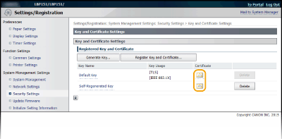 คลิก [Key and Certificate Settings] หรือ [CA Certificate Settings]