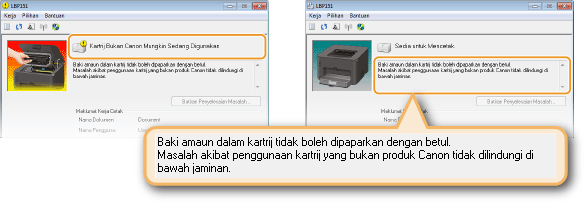 Jika anda teruskan mencetak apabila <Kartrij Bukan Canon Mungkin Sedang Digunakan> dipaparkan, klik
