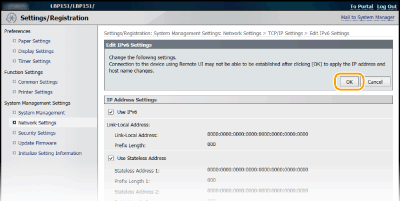 Gunakan Remote UI untuk menetapkan alamat IPv6. Sebelum menetapkan alamat IPv6, pastikan alamat IPv4 telah ditetapkan dengan betul (Melihat Tetapan Rangkaian). Anda boleh mendaftar sehingga sembilan daripada alamat IPv6 berikut.