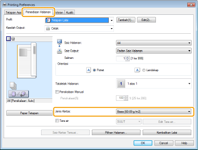 Anda boleh tentukan tataletak halaman, kedudukan pengikatan dan sebagainya dengan mudah pada imej pratonton. Untuk maklumat lanjut, klik [Help] pada skrin pemacu pencetak.