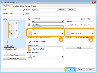Anda boleh mencetak halaman berbilang pada helaian tunggal. Contohnya, anda boleh mencetak empat atau sembilan halaman pada helaian tunggal menggunakan [4 atas 1] atau [9 atas 1]. Guna fungsi ini jika anda ingin menjimatkan kertas atau melihat dokumen anda dalam lakaran kecil.