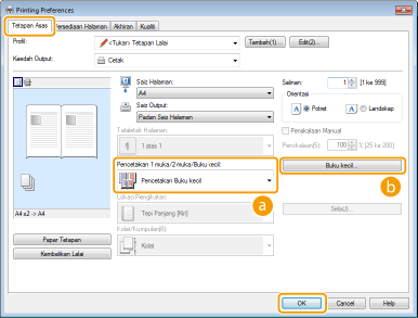 Pilih [Pencetakan Buku kecil] dalam [Pencetakan 1 muka/2 muka/Buku kecil]