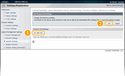 Anda boleh menyulitkan komunikasi antara mesin dan pelayar Web pada komputer menggunakan Keselamatan Lapisan Pengangkutan (TLS). TLS ialah mekanisme untuk menyulitkan data yang dihantar atau diterima melalui rangkaian. TLS mesti dibolehkan apabila Remote UI digunakan untuk menentukan tetapan bagi pengesahan IEEE 802.1X (TTLS/PEAP) atau SNMPv3. Untuk menggunakan TLS bagi Remote UI, anda perlu menetapkan pasangan kunci dan membolehkan fungsi TLS. Jana atau pasangkan pasangan kunci untuk TLS sebelum membolehkan TLS (