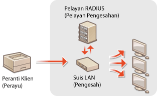 Mesin boleh bersambung dengan rangkaian 802.1X sebagai peranti klien. Rangkaian 802.1X yang biasa terdiri daripada pelayan RADIUS (pelayan pengesahan), suis LAN (pengesah) dan peranti klien dengan perisian pengesahan (perayu). Jika peranti cuba untuk bersambung dengan rangkaian 802.1X, peranti tersebut mesti melalui pengesahan pengguna untuk membuktikan bahawa penyambungan dibuat oleh pengguna yang sah. Maklumat pengesahan dihantar dan diperiksa oleh pelayan RADIUS, yang mengizinkan atau menolak komunikasi ke rangkaian bergantung pada hasil pengesahan. Jika pengesahan gagal, suis LAN (atau titik capaian) menyekat capaian daripada luar rangkaian.