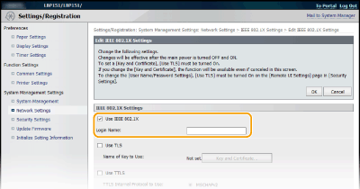 Pilih kotak semak [Use IEEE 802.1X], masukkan nama log masuk ke dalam kotak teks [Login Name] dan tentukan tetapan yang diperlukan.