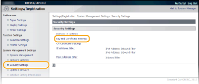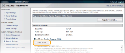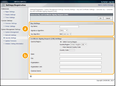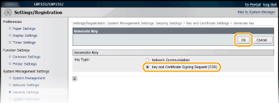 Pasangan kunci boleh dijana dengan mesin apabila ia diperlukan untuk komunikasi tersulit melalui Keselamatan Lapisan Pengangkutan (TLS). Anda boleh menggunakan TLS apabila mencapai mesin melalui Remote UI. Sehingga lima pasangan kunci, termasuk pasangan prapasang, boleh didaftarkan. Sijil ditandatangani sendiri digunakan dengan pasangan kunci yang dijana dalam "Komunikasi Rangkaian". Dengan "Kunci dan Permintaan Tandatangan Sijil (CSR)", anda boleh memohon untuk Sijil Digital keluaran-CA untuk pasangan kunci yang dijana oleh mesin itu.