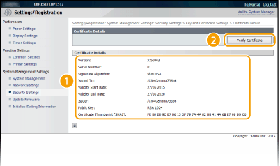 Klik [Key and Certificate Settings] untuk menentusahkan pasangan kunci atau [CA Certificate Settings] untuk menentusahkan sijil CA.